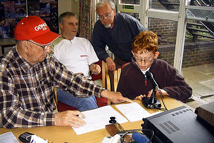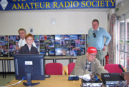 We had many visitors talking to us about amateur radio, some went away with leaflets and old copies of RadCom and PW that were on show. As far as radio went, as usual there wasn't much action, although I think we managed to nearly fill a page of the logbook, thanks to the efforts of Ken G0MKN, Tom G4BYE, and some excellent operating by Alex M3IZR under the very difficult conditions of other amateurs in the room. Ken G0MKN was a great help to Alex. We used both "real" radio and CW [HI] for the few contacts made.
